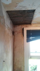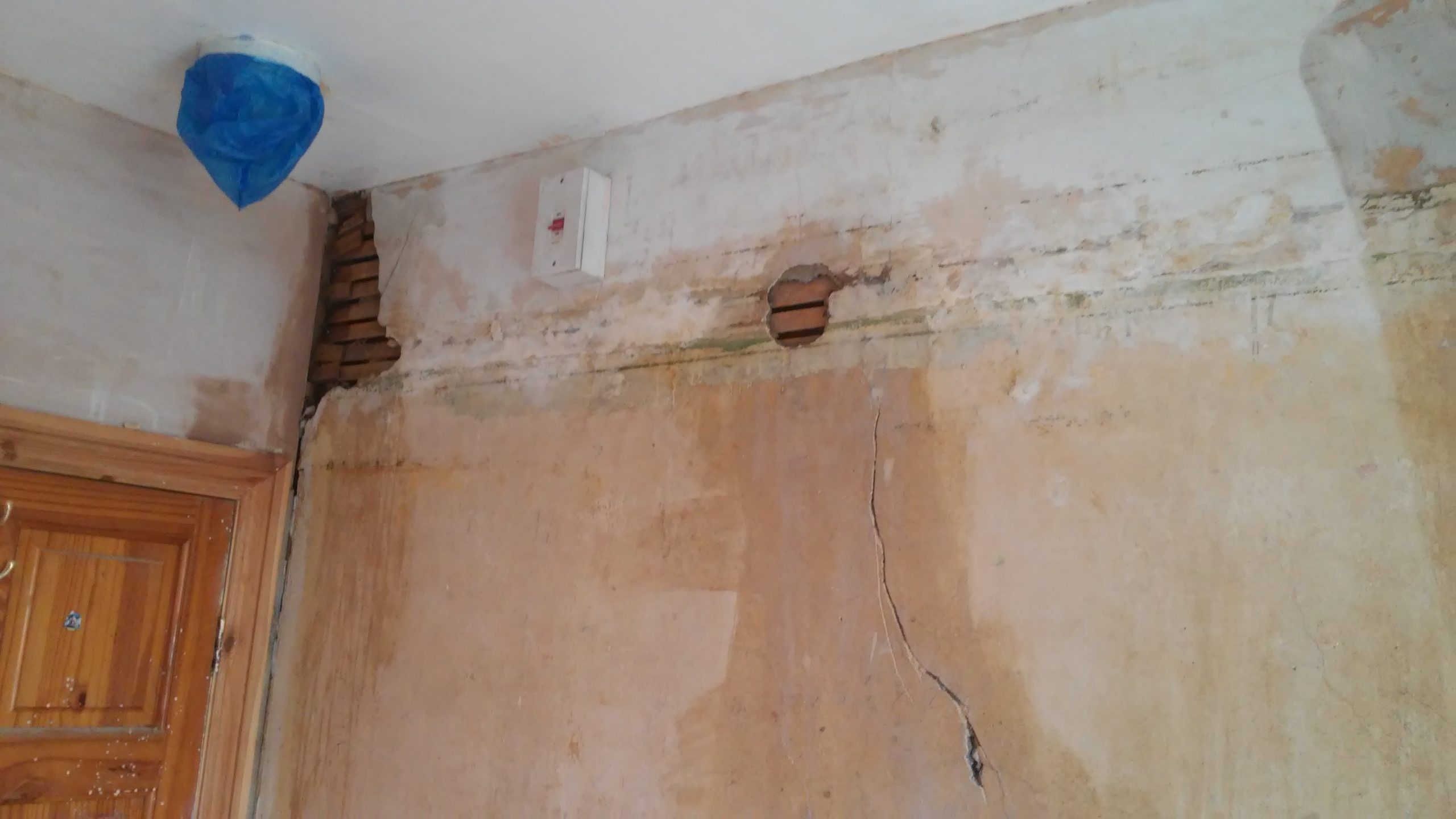 Tearing off the grey wallpapers and chiselling out the damaged old plasters